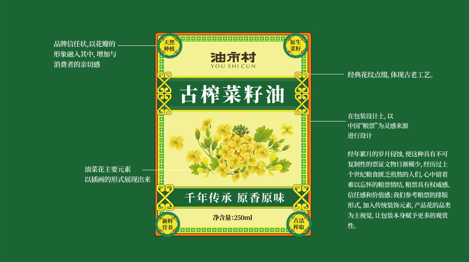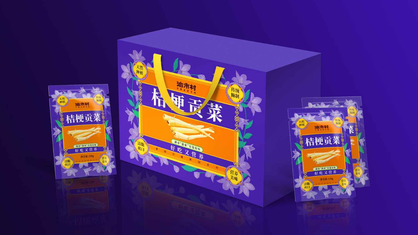 創(chuàng)意設(shè)計(jì)服務(wù)于品牌定位,從油市村資源稟賦和未來(lái)發(fā)展戰(zhàn)略出發(fā),我們?yōu)橛褪写逄釤捔颂烊?、綠色、文化、傳承四大品牌核心形象,基于此,在農(nóng)特產(chǎn)品開(kāi)發(fā)方面,我們從產(chǎn)品屬性和文化屬性兩個(gè)方面深入挖掘油市村農(nóng)產(chǎn)品的差異化賣點(diǎn),并通過(guò)插畫或?qū)嵟牡姆绞?,著重表現(xiàn)農(nóng)產(chǎn)品本身的樣子,在油市村得天獨(dú)厚的人文地理優(yōu)勢(shì)加持下,包裝設(shè)計(jì)不需要過(guò)多的美化,讓消費(fèi)者真實(shí)感受自然之美,盛放的鮮花,翠綠的樹(shù)葉,豐碩的果實(shí)……所有的一切,自然傳達(dá)出油市村農(nóng)特產(chǎn)品的天然、營(yíng)養(yǎng)以及背后樸實(shí)但千年傳承不息的農(nóng)耕文化之美