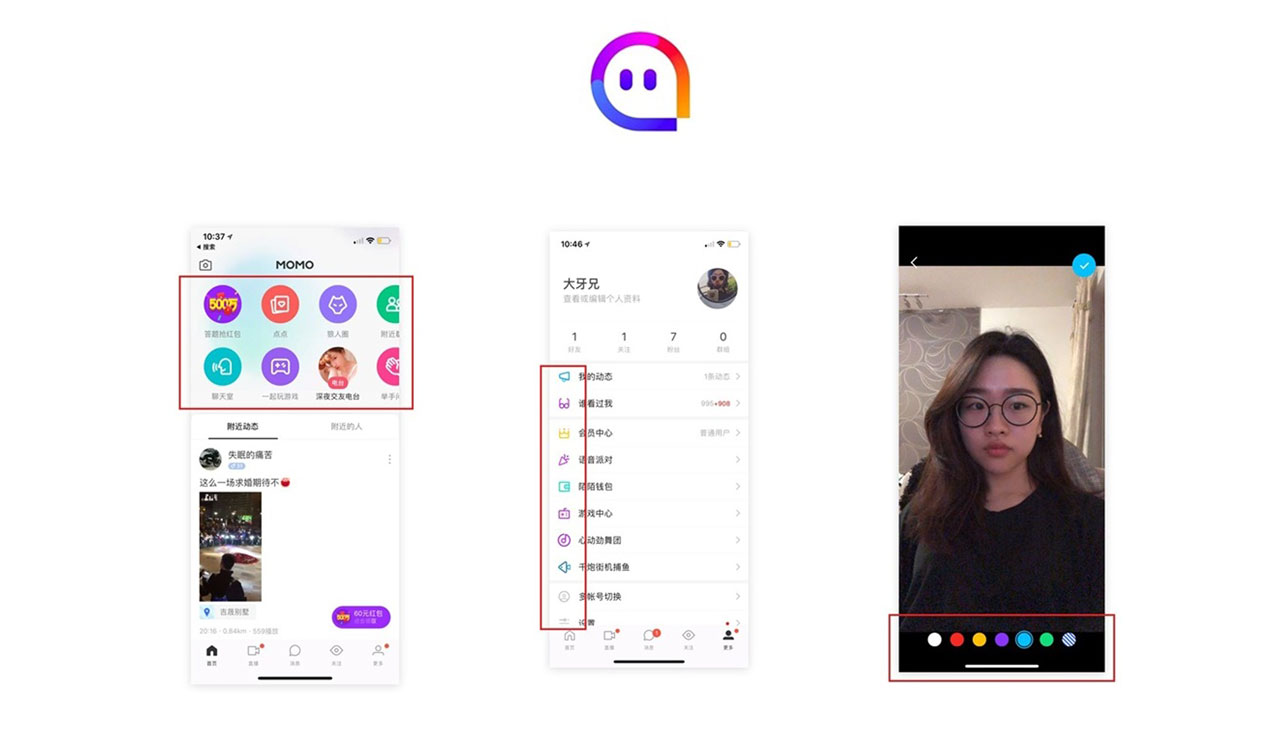 比如:陌陌的 ICON 設(shè)計,是提取了 LOGO「形」和「色」,進(jìn)行基因延續(xù)( LOGO 提取法),形成自己獨特且具有識別性的設(shè)計語言。「更多」頁面 ICON 的繪制,也是延續(xù) LOGO 的處理手法。就連照片編輯頁面的筆刷顏色,也是運用品牌一致的配色,使品牌感知更強烈 。