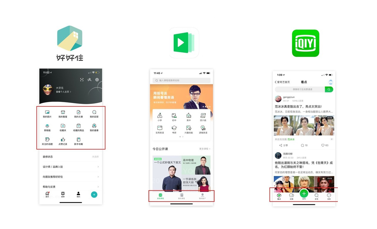 還有好好住,也是通過對 LOGO 的「色」進(jìn)行提取,運用到自己的 ICON 設(shè)計上。有道精品課,底部的 ICON 風(fēng)格,提取了 LOGO 的綠色和半透明的基因,在未選中的灰色 ICON 上也進(jìn)行這種處理手法的延續(xù)。愛奇藝的「泡泡」,是品牌做的比較好的模塊,因為它既延續(xù)了愛奇藝的主色「綠色」,同時,針對泡泡的用戶群體,又做了跟愛奇藝差異化,符合定位的趣味化處理,對母品牌基因,做了很好的延續(xù)和差異。
