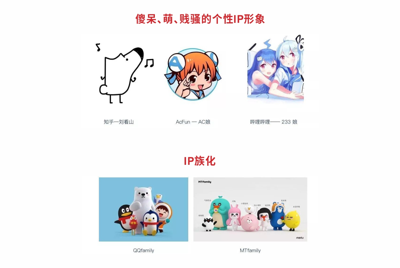 近十年來,在早期一些互聯(lián)網(wǎng)品牌變化中,我們發(fā)現(xiàn)京東、天貓、當(dāng)當(dāng)、國美……很多品牌都在打造動物形象。從 2016 年開始,各個企業(yè)的品牌設(shè)計出現(xiàn)的一些新的方向,他們打造符合品牌的 IP 形象符號或者 IP family,比如知乎劉看山、 AcFun 的 AC 娘、嗶哩嗶哩的 2233 娘、QQfanmily、MTfamily,用一些傻呆、萌、賤、騷等個性鮮明的形象吸引粉絲,獲得用戶對品牌的好感度。