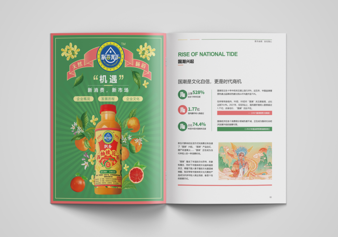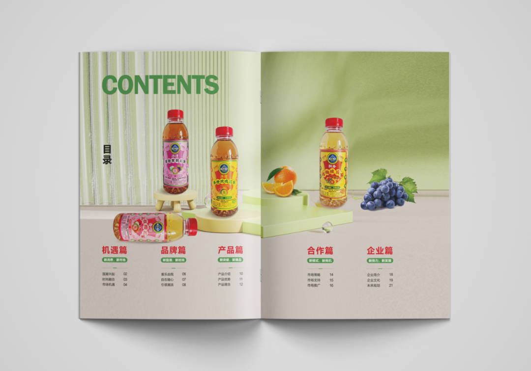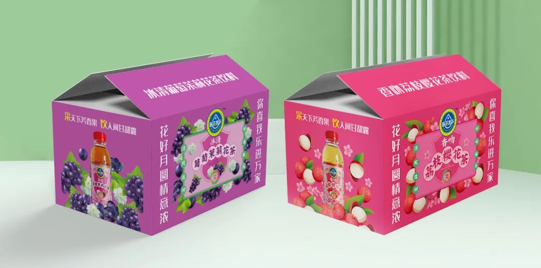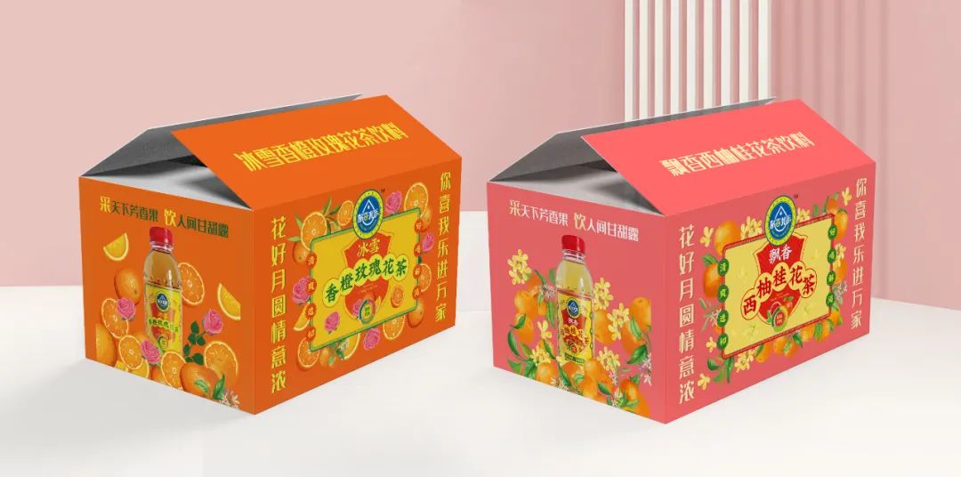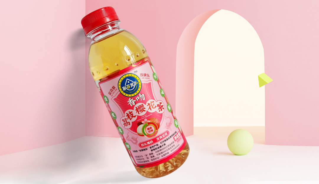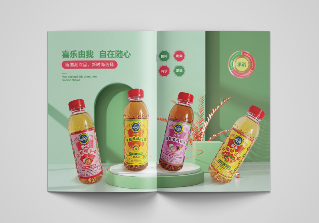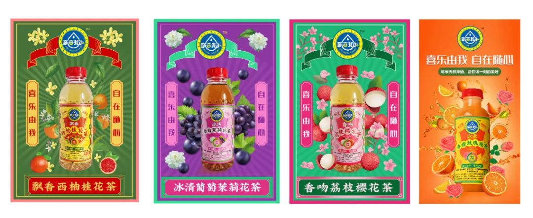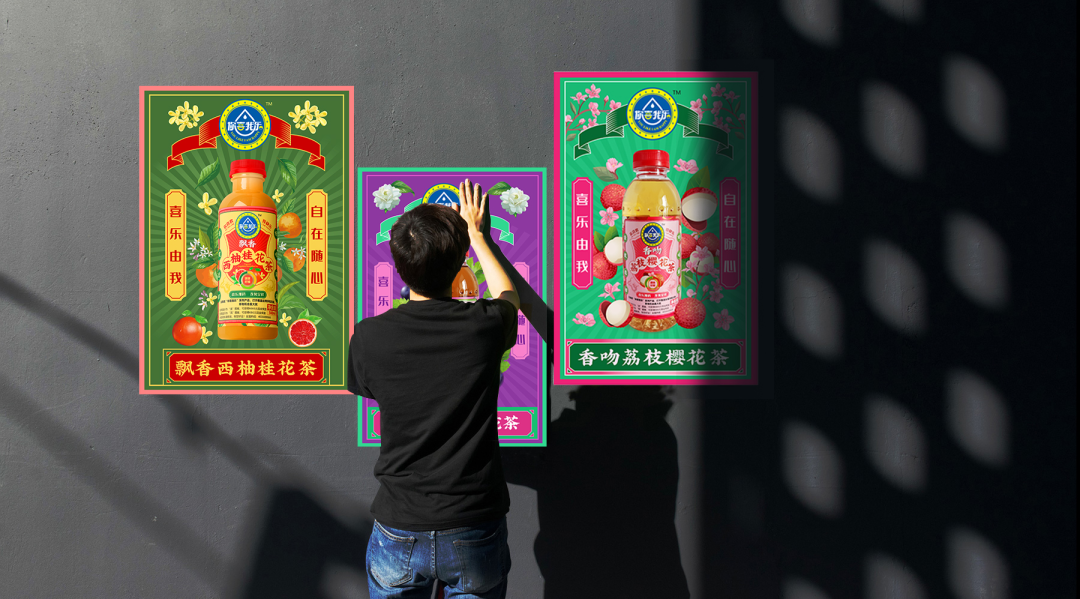 創(chuàng)造超級(jí)花邊,花邊的任務(wù)就是抓住消費(fèi)者的眼球,紅綠黃三種顏色的碰撞,耀眼醒目,強(qiáng)制消費(fèi)者看過來,實(shí)現(xiàn)驚鴻一瞥的視覺效果,其次建立起品牌的獨(dú)特資產(chǎn)。四周以果味花茶飲料產(chǎn)品本身的原色為主色調(diào),富有強(qiáng)烈的視覺沖擊感,帶給消費(fèi)者充滿浪漫感的情緒互動(dòng)。西柚+桂花+茶,環(huán)繞四周,以高明的綠色和金色作為輔助色系,大膽的用色加深觀眾的情緒互動(dòng)。