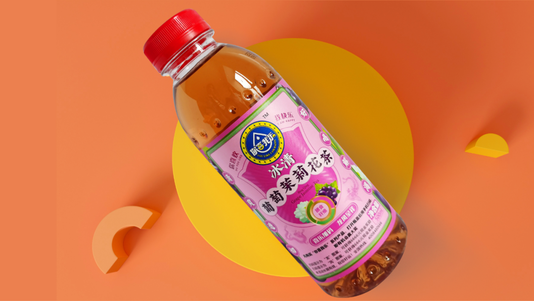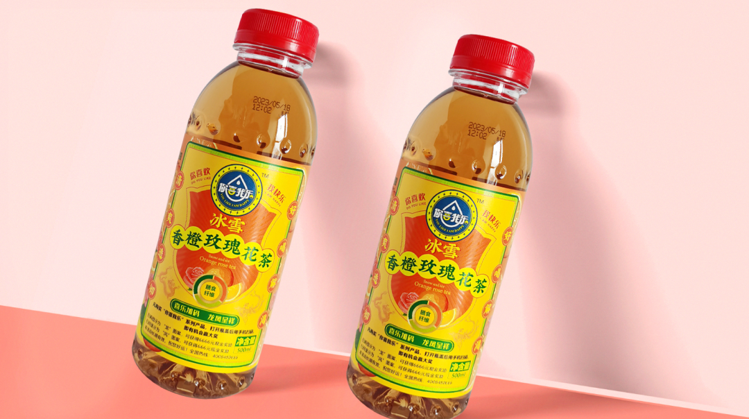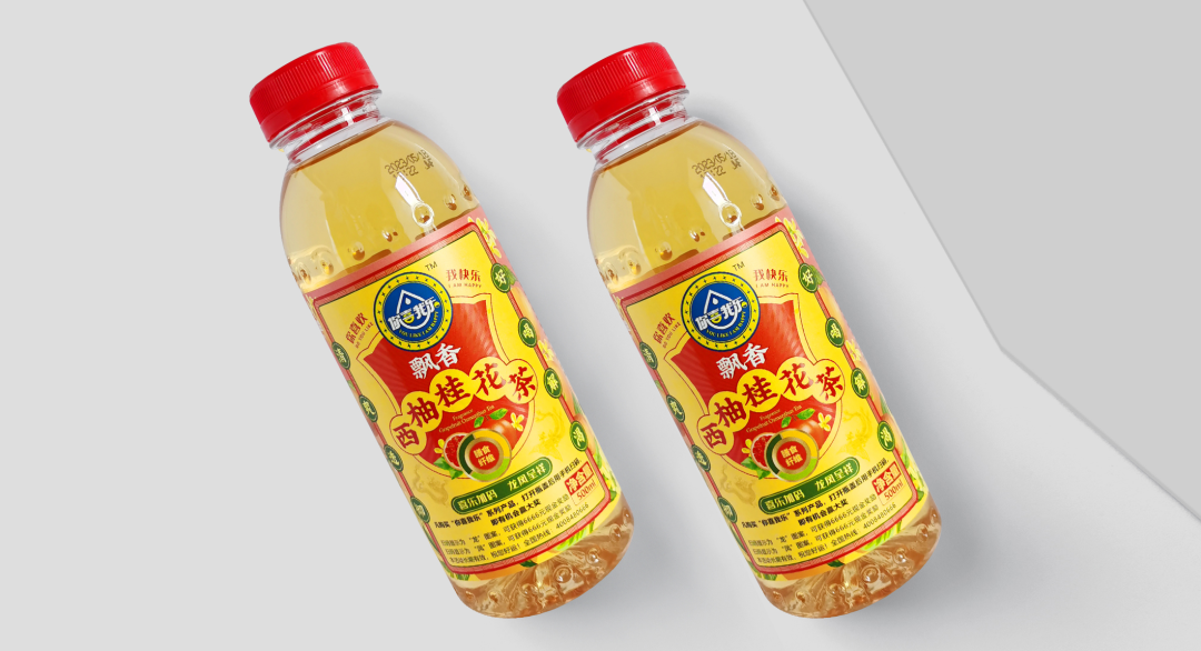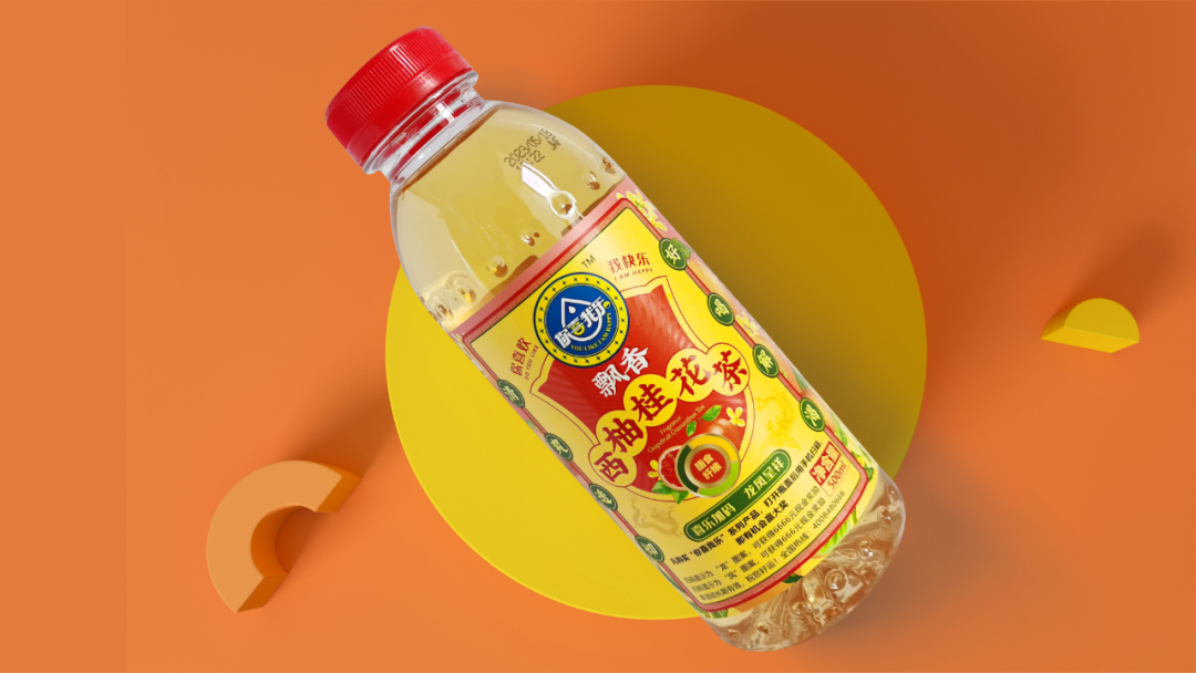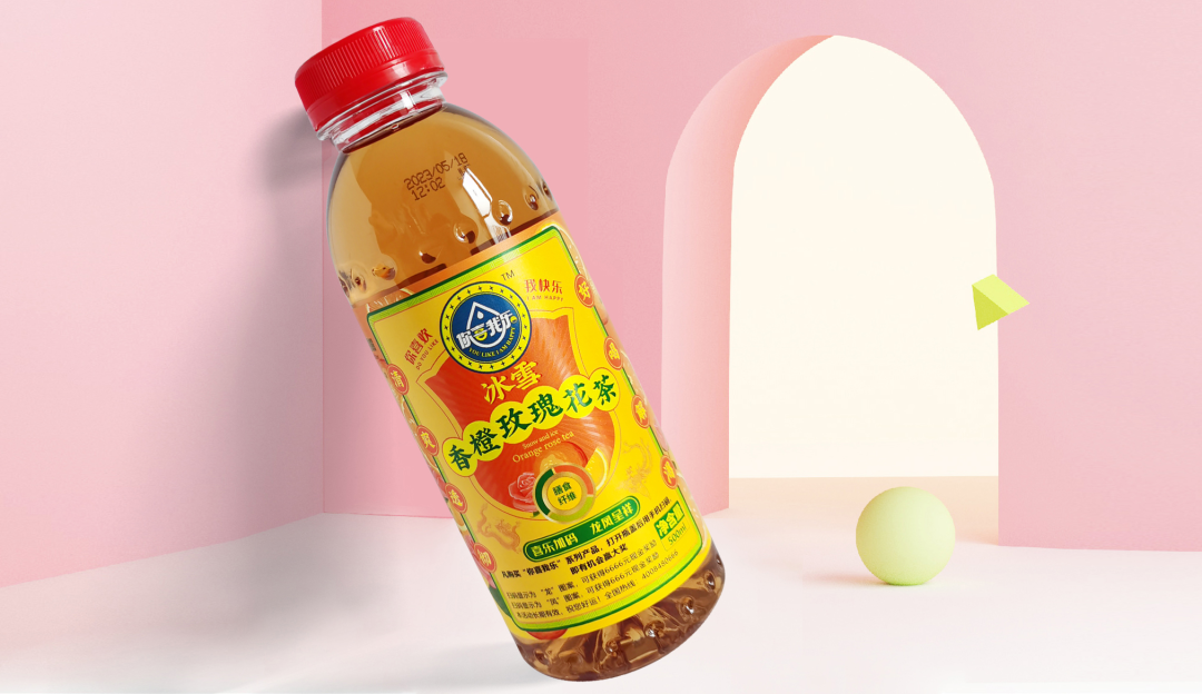 通過層級(jí)的關(guān)系梳理,我們的動(dòng)作拆解為三步:步驟一,主標(biāo)初步圖形規(guī)整;步驟二,產(chǎn)品主題畫面設(shè)計(jì);步驟三,背景色彩規(guī)劃設(shè)計(jì)。我們的產(chǎn)品是飄香西柚桂花茶,以西柚和桂花為背景色符合常理和常識(shí),桂花黃相對(duì)中性,和西柚紅在一起冷暖、明度、純度對(duì)比鮮明,單看標(biāo)簽部分很和諧,也有整體感;如果整體瓶身是紅色,那整體的標(biāo)簽對(duì)比就不那么明顯。所以我們嘗試了色彩里的絕對(duì)中性色淺黃色和紅色邊框的對(duì)比后,效果立馬出來了,整體包裝對(duì)比鮮明、和諧統(tǒng)一。從遠(yuǎn)處看也是非常的顯眼。