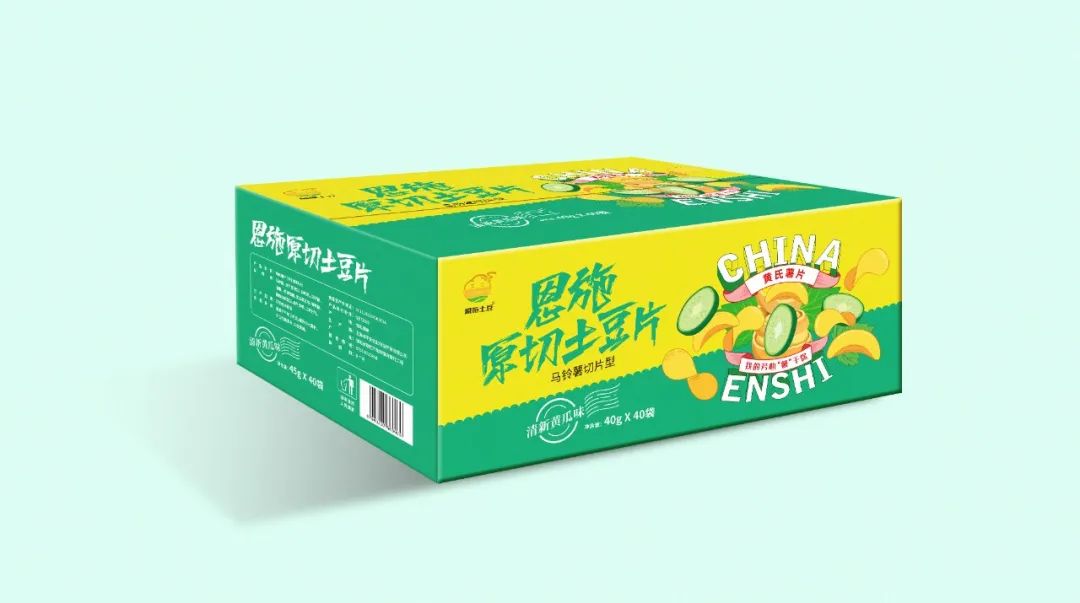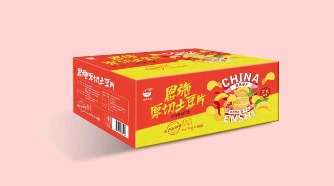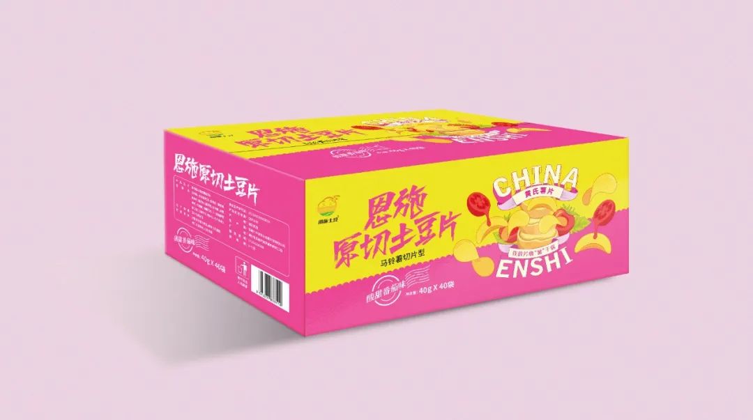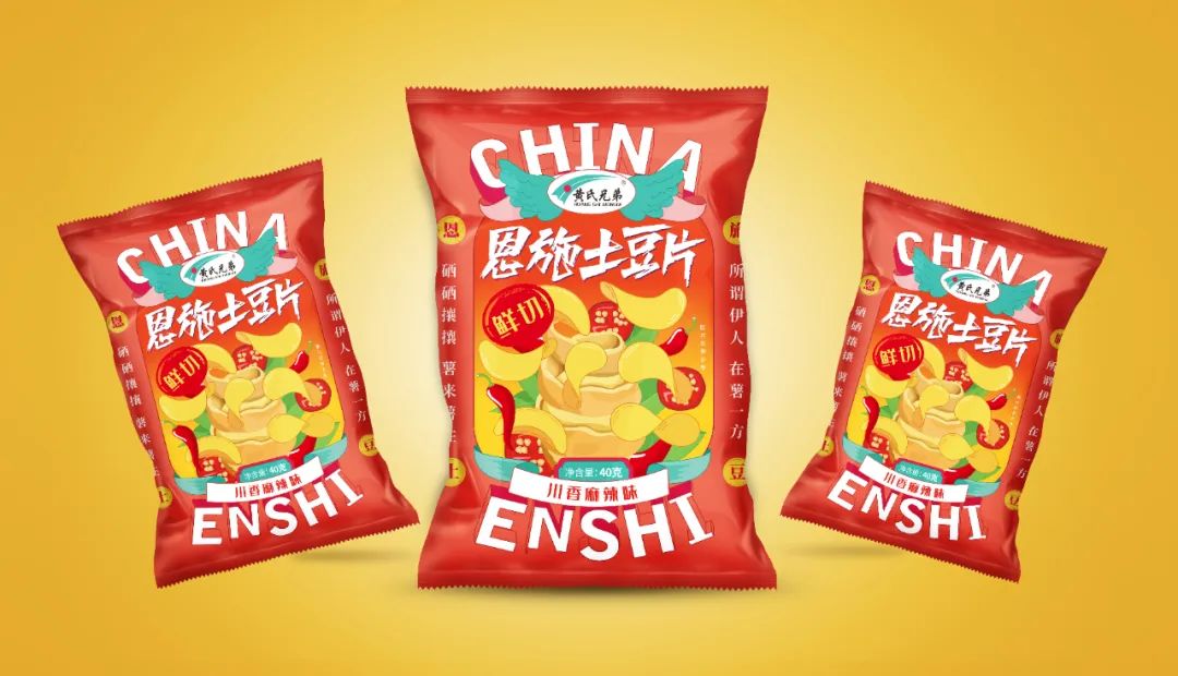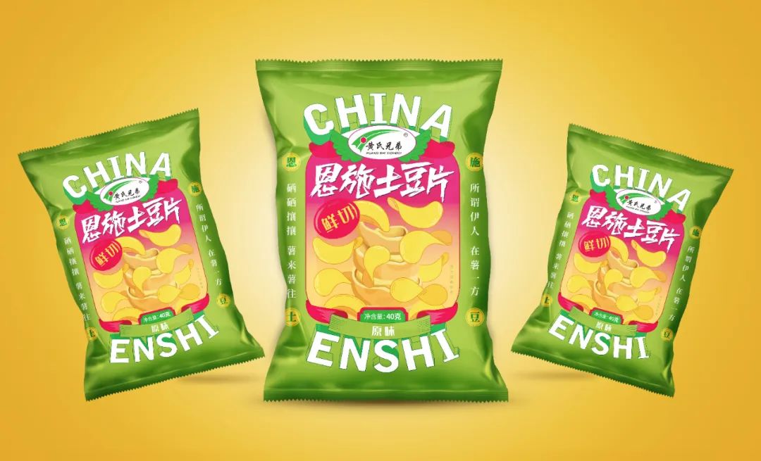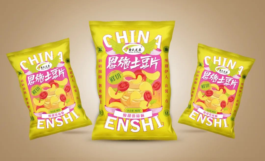 在字體選擇上,我們首先嘗試了比較粗的方正字庫黑體字。在和主標(biāo)標(biāo)簽匹配后由于此款字體的字重太粗,放在一米開外測試發(fā)現(xiàn)識別不清,主要是筆畫太粗反而影響了閱讀識別,且字形整體生硬厚重,不太適合調(diào)性。經(jīng)過分析思考,我們選擇了以手寫體為基調(diào),體現(xiàn)文化感,它骨骼清晰,更易識別。方向找準(zhǔn)后,在此基礎(chǔ)上進(jìn)行加工修正。恩施土豆片產(chǎn)品的特性為年輕、時尚、潮流、個性化張揚的字體和產(chǎn)品整體氣質(zhì)很吻合。