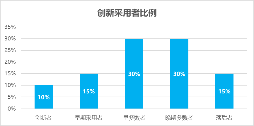 品類創(chuàng)新并不意味著就能獲得市場的認(rèn)可,因為消費者的認(rèn)知并不是純粹理性,而是受到個人認(rèn)知、需求、個性、經(jīng)濟(jì)、社交、文化等各個層面的影響,不同的消費者接受創(chuàng)新產(chǎn)品所需的時間和條件是不同的,基于該特點,社會學(xué)家提出了著名的“創(chuàng)新采用者理論”,即消費者可劃分為五個類型——創(chuàng)新者、早期采用者、早期多數(shù)者、晚期多數(shù)者和落后者。五大類別消費者的平均占比服從統(tǒng)計學(xué)上的正態(tài)分布:創(chuàng)新者10%、早期采用者15%、早多數(shù)者30%、晚期多數(shù)者30%、落后者15%。