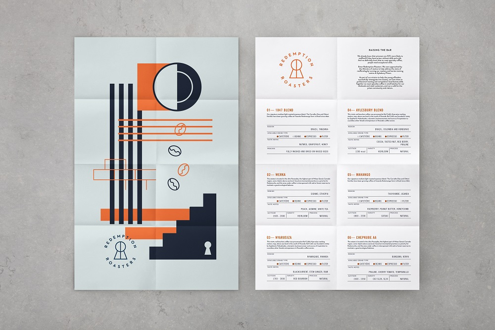 Here Design為倫敦盧姆斯伯里咖啡店提供的品牌設(shè)計(jì)。盧姆斯伯里咖啡店的咖啡豆來自于艾爾斯伯里青年犯罪監(jiān)獄,監(jiān)獄中有開設(shè)咖啡師和烘焙課程。